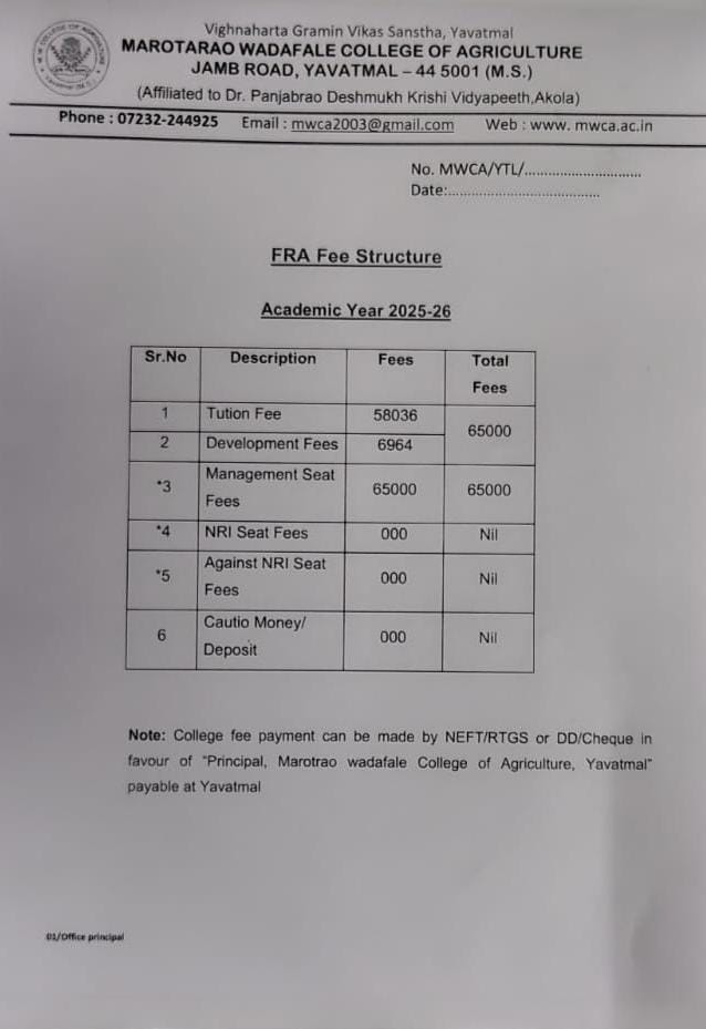 Marotrao Wadafale College of Agriculture, Yavatmal, continuously serving the farmers and students community since 2003. We work with the core belief that wisdom can be cultivated gradually amongst all individuals. It is not enough to make students academically intelligent what is more important is to make them wise so that they are able to use their intelligence judiciously on the actual field. We want to mould a generation who can serve and succeed not only in their respective careers but also in serving humanity and sensitivity towards the world at large. For inculcating the true spirit of humanity, I wish to create an atmosphere where the students may grow with a true spirit of tolerance and respect for all religions, reverence for elders, sensibility to their cultural ... heritage and courage to face the present challenges in Agriculture.The educational needs of today are very different from those of the past because traditional education will make you a job seekers but Agriculture education make you job creators in growing competition. The students must be equipped with the practical skills required to face the challenges in Agriculture. They can do it easily if we can make the surrounding stimulating and purposeful. The college therefore has undertaken a great leap in integrating theoretical and practical knowledge into the class room teaching as well as on actual field practices. We foster a positive spirit and believe in partnership between students, parents, teachers and support staff striving to create a milieu that sustains excellence. Our distinction lies in the pursuit of high academic attainment through support, encouragement, praise and motivation. We assure to do our very best always and tries best to maintain the highest quality academic standard and provide the wonderful environment for studies.. I would like to end with the words of Albert Einstein: "I cannot teach anybody anything, I can only make them think"- Socrates.Read more
